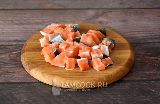 Снятое с хвоста семги филе нарежьте довольно крупными кубиками, чтобы они чувствовались в супе.