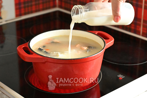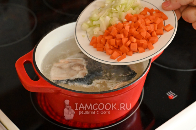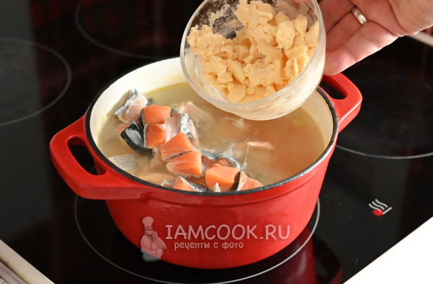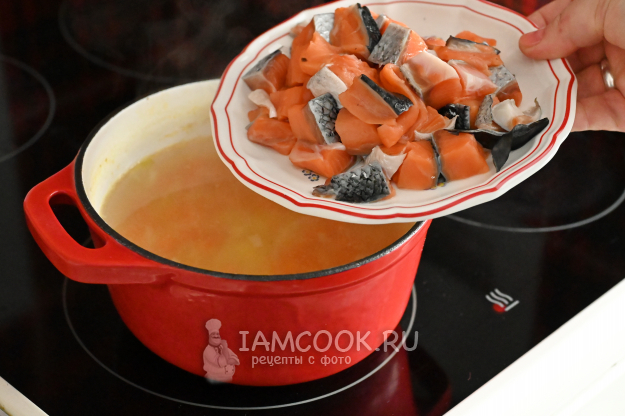 Теперь отправьте в кастрюлю нарезанную мякоть семги.