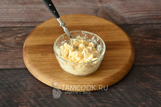 Плавленый сыр натрите на тёрке или просто разомните вилкой.