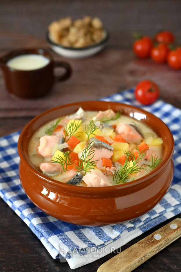 Суп с семгой и плавленым сыром готов, пора накрывать на стол.
