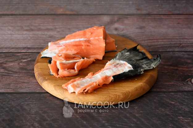 Хвост семги очистите от чешуи, ополосните, обсушите. Сделайте два продольных надреза и снимите мякоть, затем аккуратно срежьте мякоть со всех косточек.