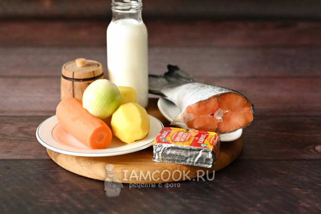 Соберите все необходимые продукты для приготовления супа с семгой и плавленым сыром.