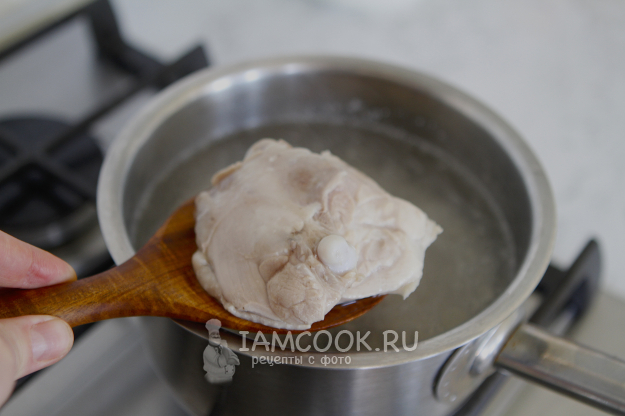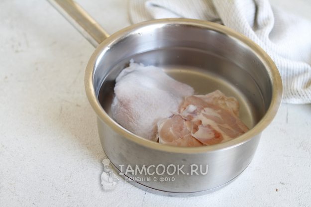 Бедра промойте под проточной водой и отправьте в кастрюлю. Влейте воду. Как только закипит вода, посолите и варите мясо до готовности.