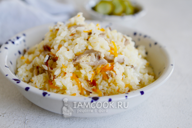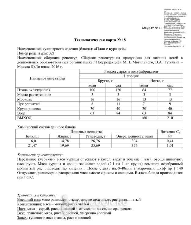 Больших казанов в садах нет, поэтому готовят плов в кастрюле. Сначала отваривают мясо. Чистят и шинкуют овощи, слегка обжаривают их, затем добавляют отварное мясо. Вливают воду, добавляют рис, доводят до кипения и отправляют кастрюлю в производственный шкаф на 30-40 минут, выставив температуру 140 градусов.