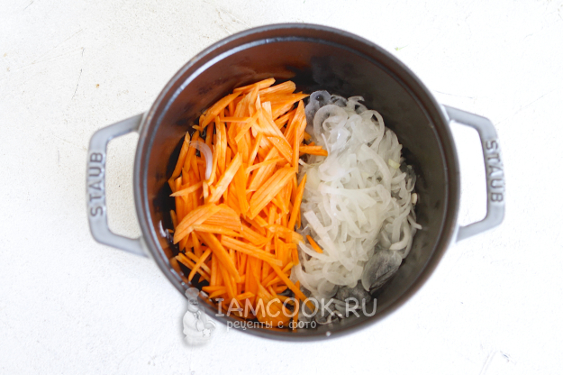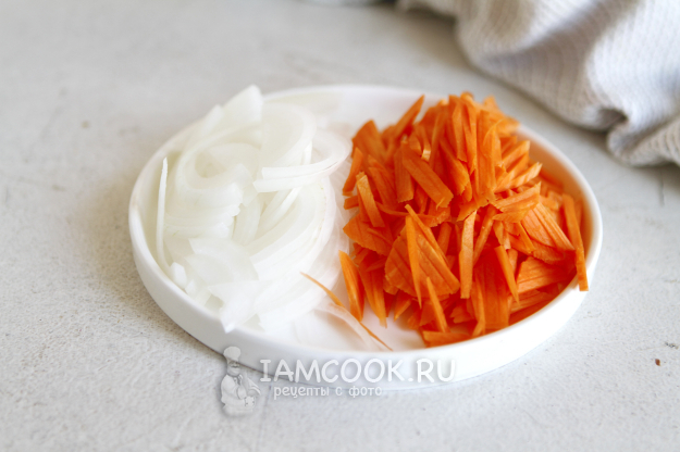 Почистите овощи. Лук нарежьте полукольцами, а морковь - мелкой соломкой.