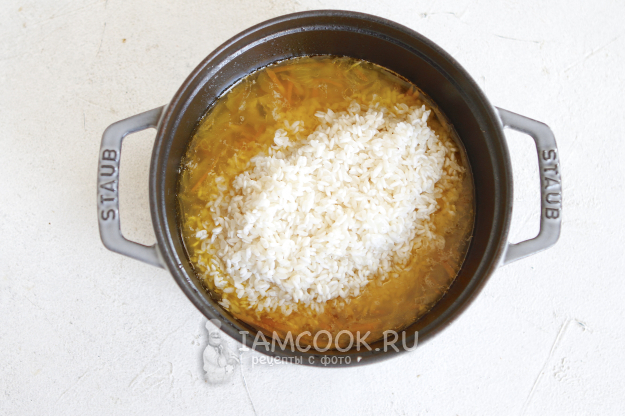 С риса слейте воду и выложите его в казан.