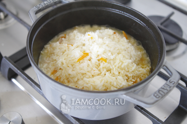 Разровняйте его в казане поверх мяса ровным слоем. Вода должна быть выше рисового слоя примерно на 1 см.