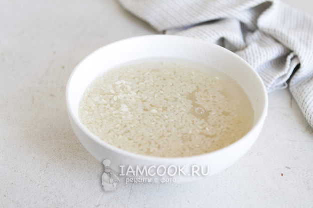 Рис тщательно нужно будет промыть под проточной водой. Затем залить его чистой водой и отставить сторону.