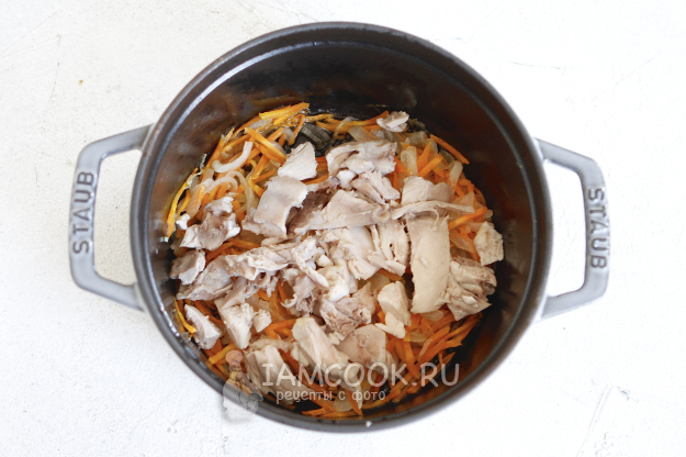 Пока обжариваете овощи, разделайте куриное мясо. Снимите кожуру, отделите мясо от кости и нарежьте его на небольшие кусочки.