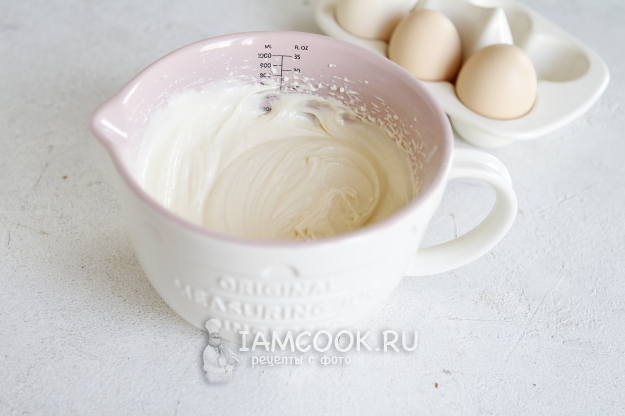 Размягченное сливочное масло переложите в миску, всыпьте сахар. Взбейте сахар с маслом до пышности.