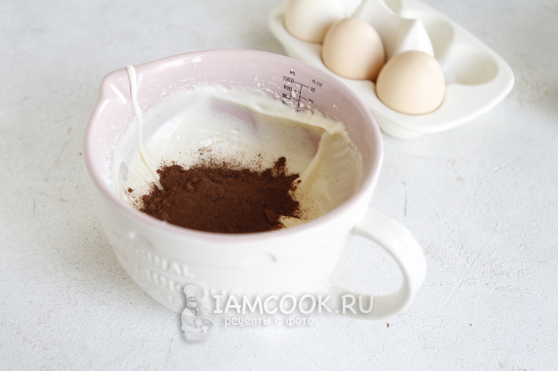 В одну часть добавьте какао и еще раз тщательно взбейте тесто миксером. Для насыщенного шоколадного вкуса рекомендую использовать какао без сахара.