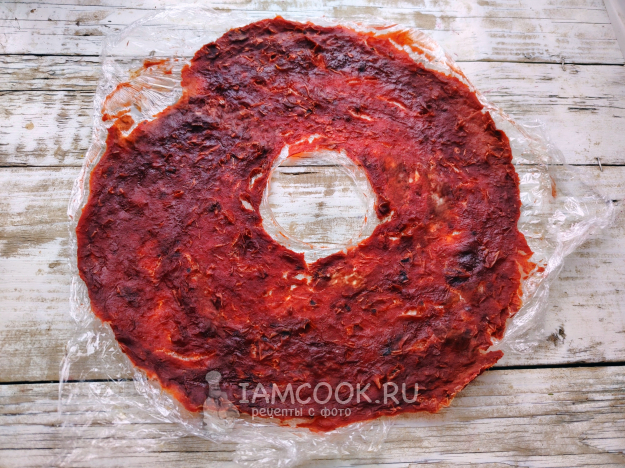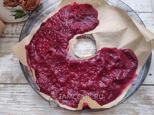 Выложить массу тонким слоем в поддон сушилки. Если он с дырочками, то его стоит затянуть пергаментом или пищевой пленкой.