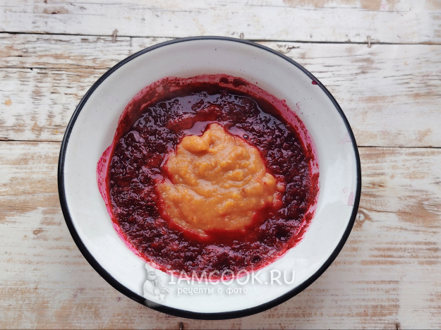 Соединить овощное и фруктовое пюре, добавить сахар, чайную ложку лимонного сока. Перемешать, чтобы сыпучие компоненты полностью растворились. Можно потушить массу на плите, чтобы уменьшить количество жидкости.