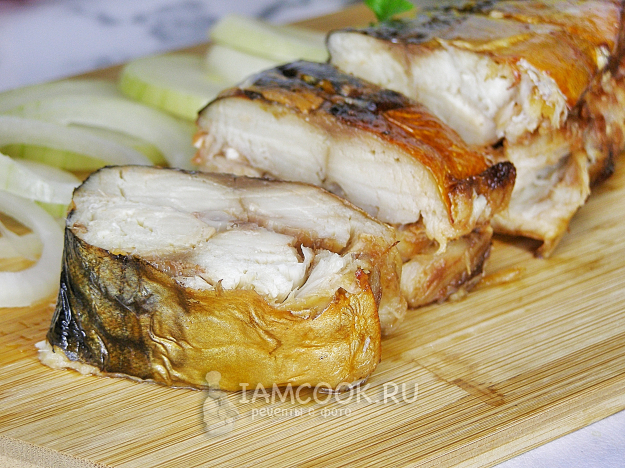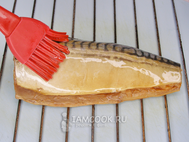 Засоленную рыбку достаём из кастрюли и слегка просушиваем бумажным полотенцем снаружи и изнутри. Смазываем скумбрию растительным маслом с обеих сторон, также немного смазываем решётку, на которой будем «коптить» рыбу. Ставим духовку на режим конвекции на 100 градусах и «коптим» скумбрию с жидким дымом 40 минут. Затем переворачиваем рыбу и убираем обратно в духовку ещё на 20 минут.