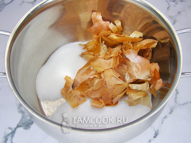 Сначала приготовим рассол. В кастрюлю насыпаем соль, сахар, добавляем луковую шелуху (и/или чай), заливаем водой. Ставим кастрюлю на огонь, доводим до кипения, варим минут 5, затем снимаем с огня и оставляем остывать до комнатной температуры.
