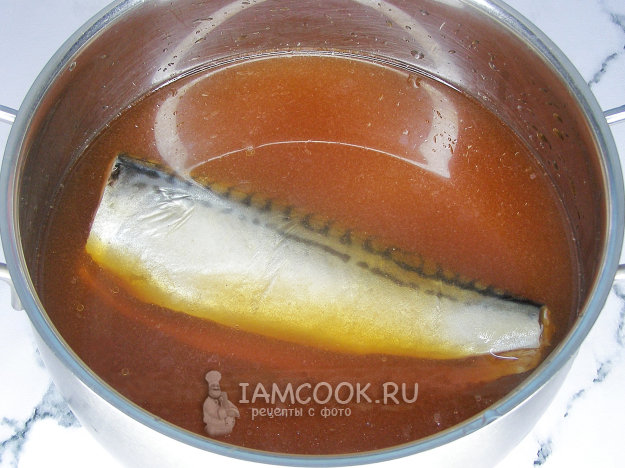 У скумбрии отрезаем голову, удаляем внутренности, обязательно убираем чёрную плёнку. Ополаскиваем рыбу холодной водой и кладём в рассол с жидким дымом. Убираем в холодильник на 10-12 часов, периодически переворачивая её на другой бочок.