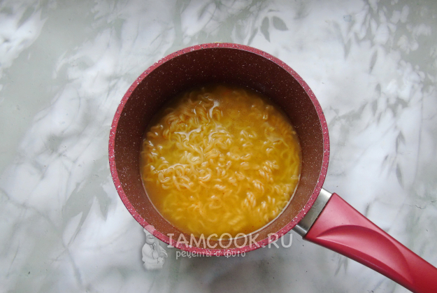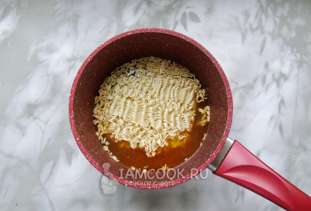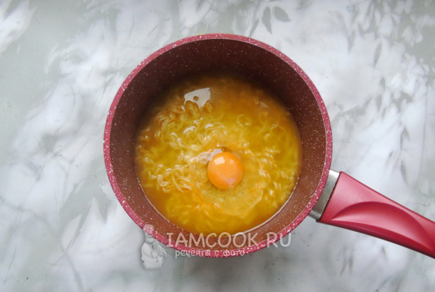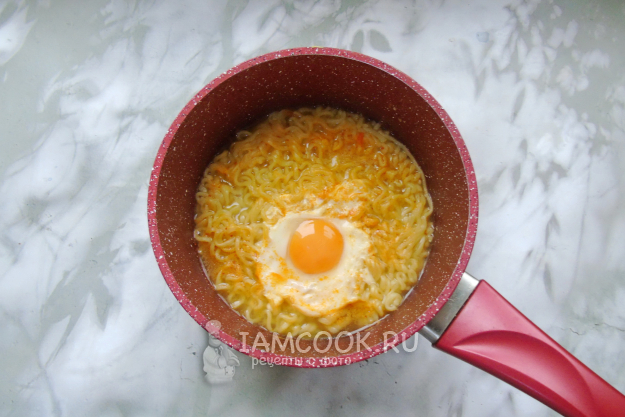Разбейте в лапшу яйцо и накройте кастрюлю крышкой.