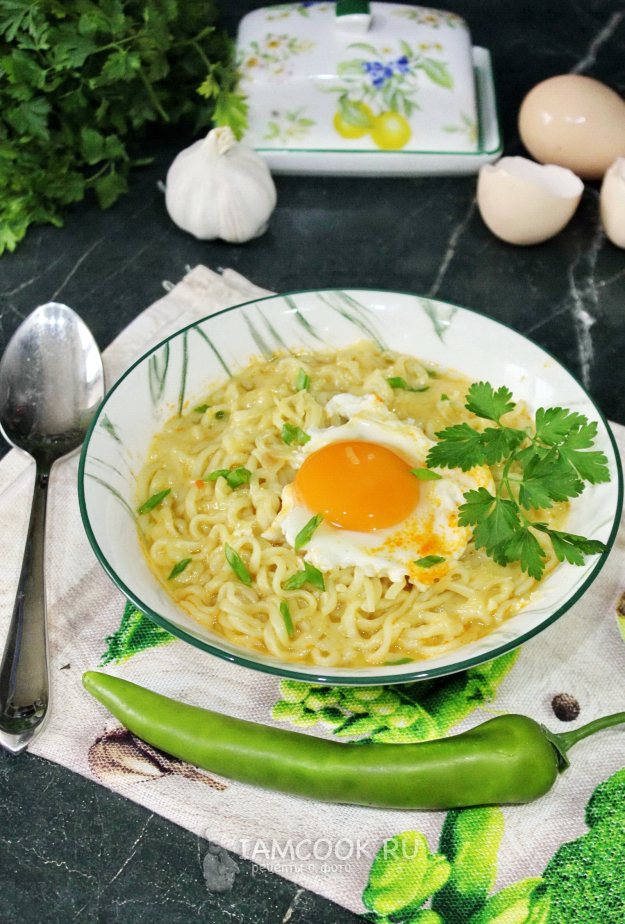 Аккуратно переложите горячую лапшу с яйцом в тарелку. Посыпьте тертым сыром и нарезанным зеленым луком. Рамен с сырым яйцом готов.