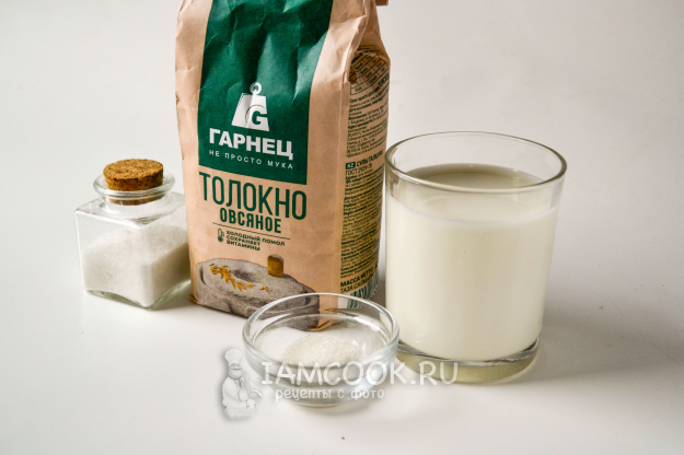 Соберите продукты для приготовления каши из овсяного толокна на молоке с водой.