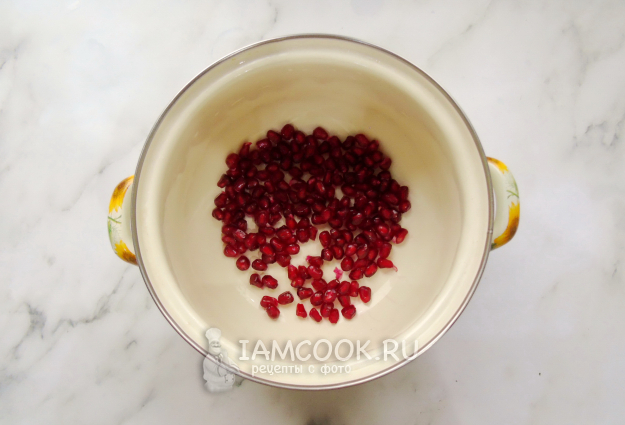 Гранат помойте, разрежьте и достаньте зерна. Выложите в кастрюлю.