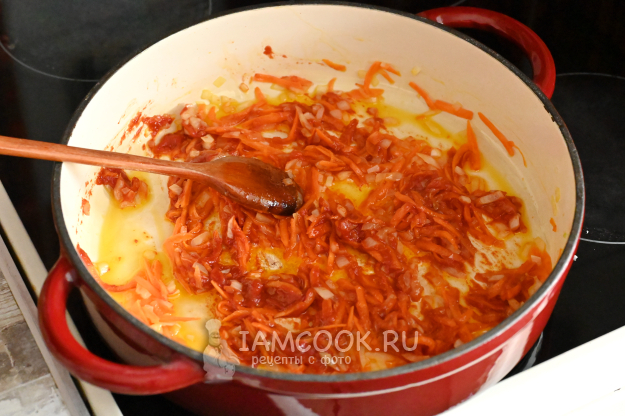 Приготовим соус, в котором будем тушить голубцы. Для этого на масле слегка поджарьте лук с морковкой, затем добавьте томатную пасту.