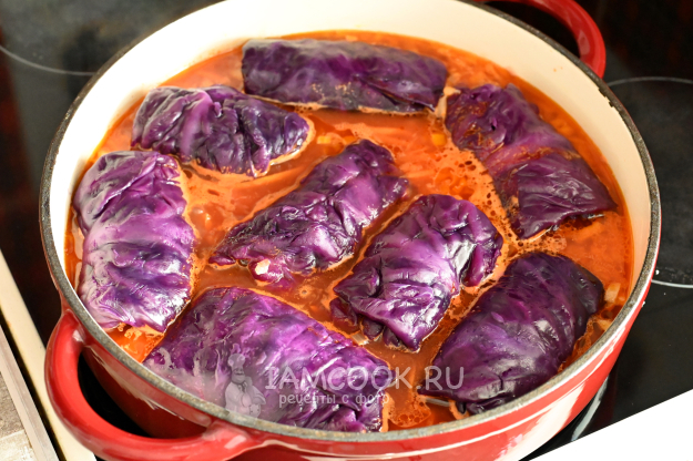 Краснокочанная капуста сама по себе довольно жёсткая, поэтому голубцы из неё тушатся чуть дольше обычных. Я тушила голубцы 45 минут.