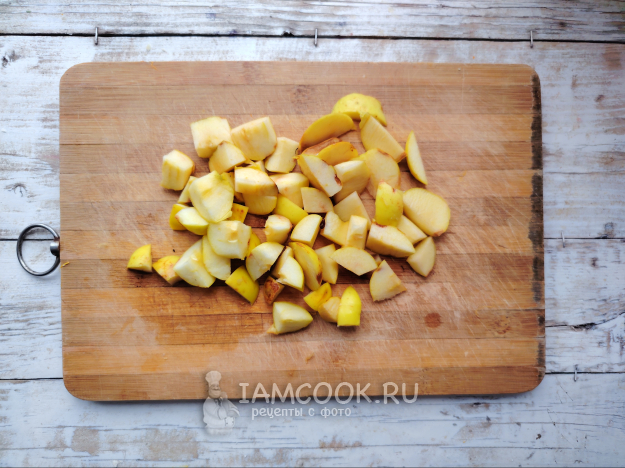 Яблоки помыть, нарезать кубиками, удалив семенную коробочку. Если шкурка жесткая, то ее также нужно снять. Поместить яблочные ломтики в форму, смазанную маслом и присыпанную мукой. Сбрызнуть яблоко лимонным соком, чтобы мякоть не потемнела.