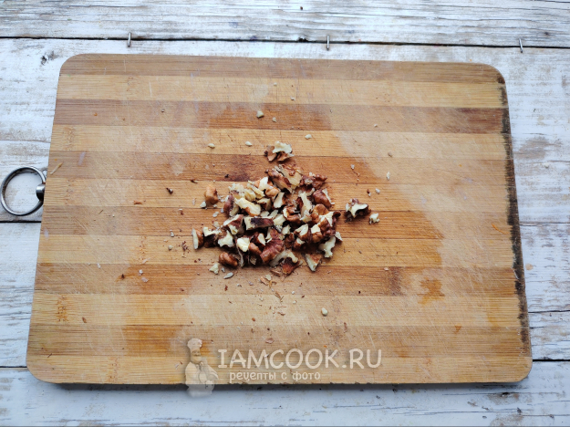 Грецкие орехи освободить от скорлупы, мелко порубить ножом. Соединить их с маслом.