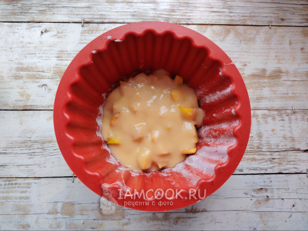 Залить тестом яблоки в форме. Отправить в духовку, разогретую до 180 градусов, на 25 минут.