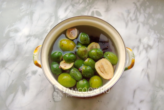 Фейхоа помойте, обрежьте кончики. Крупные экземпляры разрежьте на две части. Добавьте в кастрюлю с гранатом.
