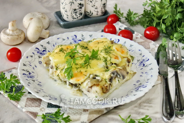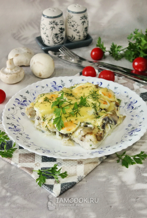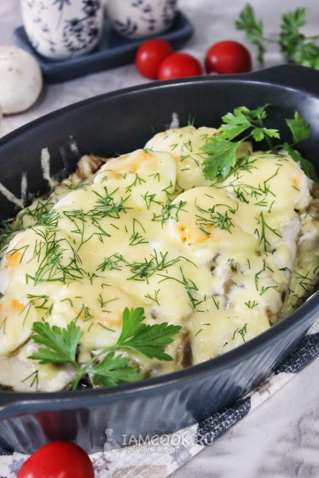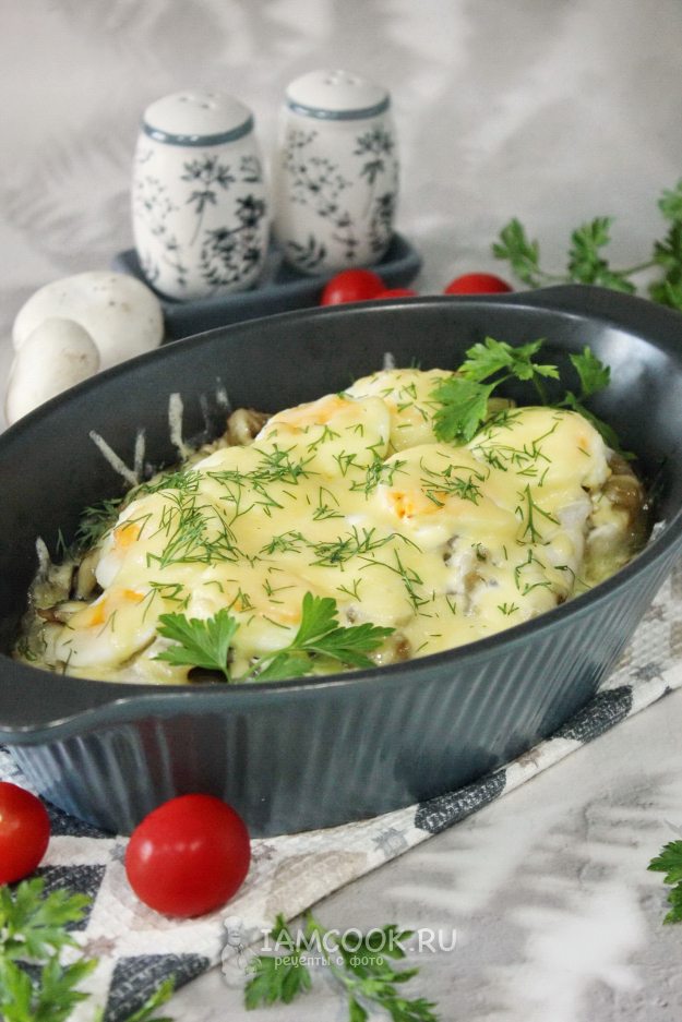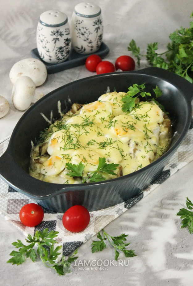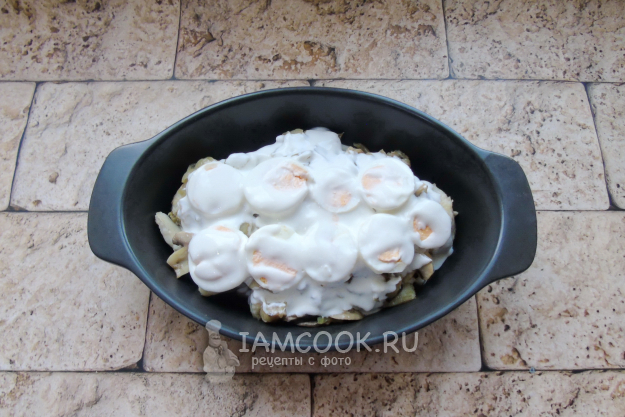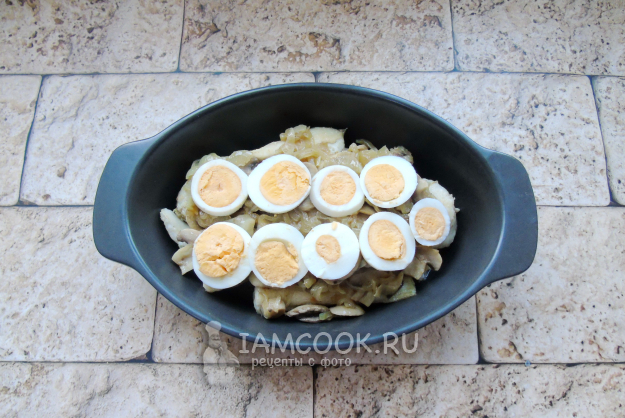 Яйца сварите вкрутую. Для этого выложите в кастрюлю, залейте водой и варите с момента закипания 10 минут. Затем достаньте из кастрюли, обдайте холодной водой, охладите и очистите. Нарежьте кружками и выложите на грибы с луком.