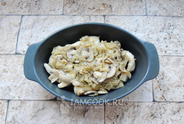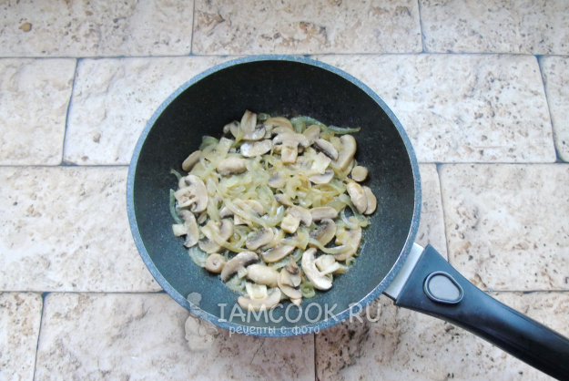 Жарьте грибы с луком до испарения жидкости. Посолите и поперчите по вкусу.