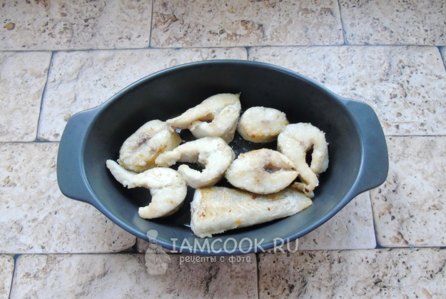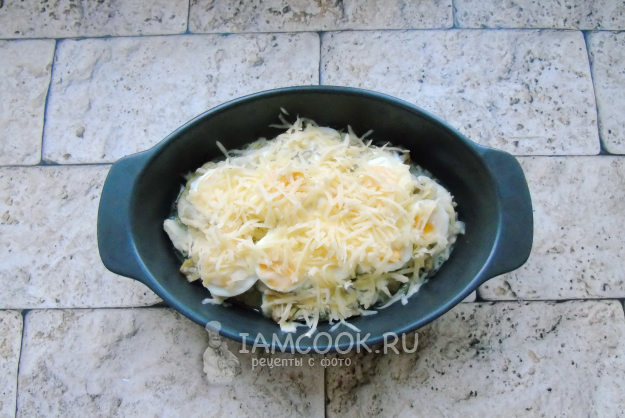 Теперь можно пойти двумя путями. Если вы не любите сырную корку, как я, то сразу поставьте рыбу в духовку и запекайте 15-20 минут при температуре 175-180 градусов. А затем посыпьте блюдо тертым сыром и верните в духовку на 5-6 минут, до расплавления сыра. А если хотите получить сырную корочку, то сразу после того как зальете сметанным соусом, посыпьте тертым сыром и запекайте до румяной корочки.