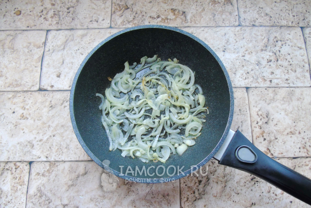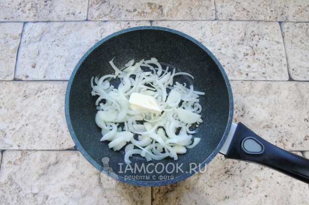 Лук очистите, помойте и нарежьте полукольцами. Выложите в горячую сковороду, добавьте 20 граммов сливочного масла.