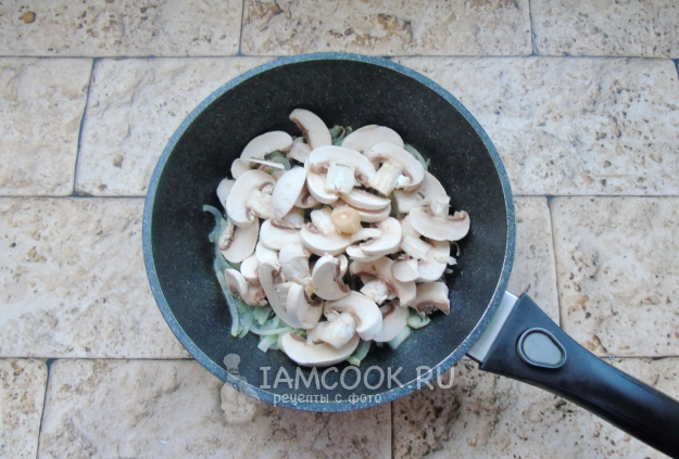Шампиньоны очистите, помойте и нарежьте пластинами. Добавьте к луку.