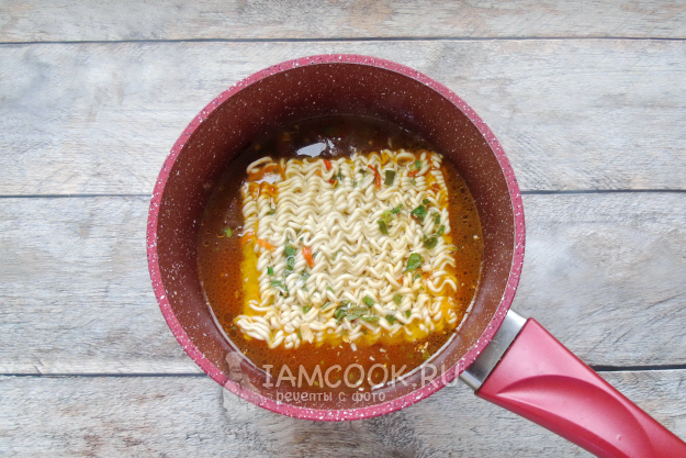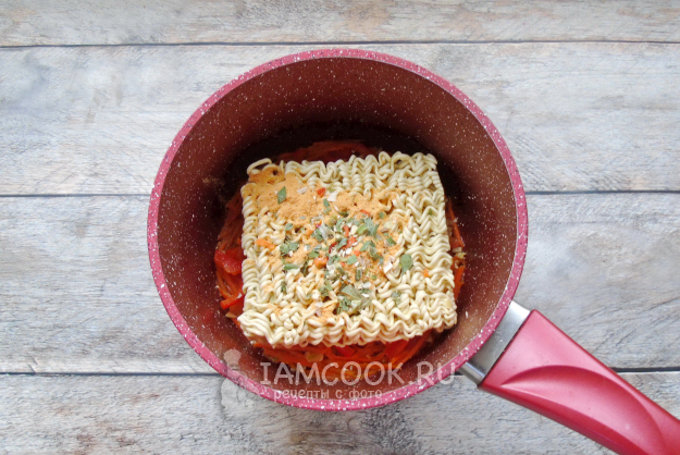 Рамен достаньте из пакета и выложите в кастрюлю с овощами. Насыпьте приправы из упаковки.