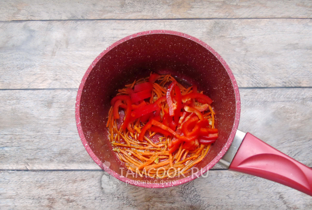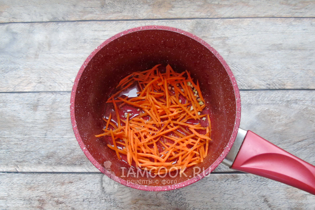 Морковь нарежьте на терке для моркови по-корейски или просто соломкой. Добавьте к чесноку. Жарьте 3-4 минуты.