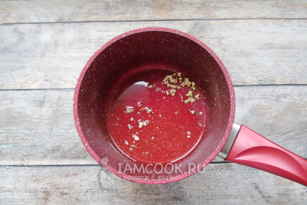 Чеснок мелко нарежьте и выложите в кастрюлю с растительным маслом. Жарьте 1-2 минуты.