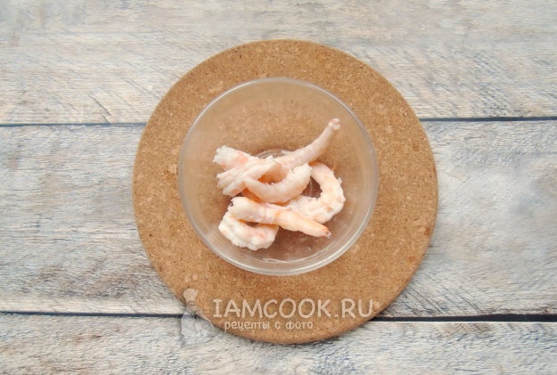 Варено-мороженые креветки залейте кипятком на 10 минут. После промойте в воде и очистите от головы, панциря и кишечной вены.
