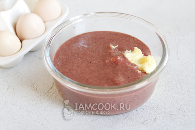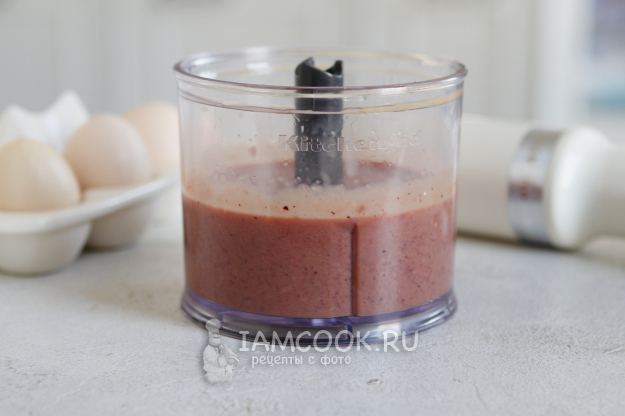 На максимальной скорости работы вашего блендера измельчите куриную печенку. Я бы на этом этапе посоветовала полученную массу протереть через сито. Я не протирала, и это было моим упущением. В процессе поедания готовой запеканки, мне попалось несколько непережевываемых кусочков, прожилок. И это даже несмотря на то, что я ее, на мой взгляд, хорошо зачистила.