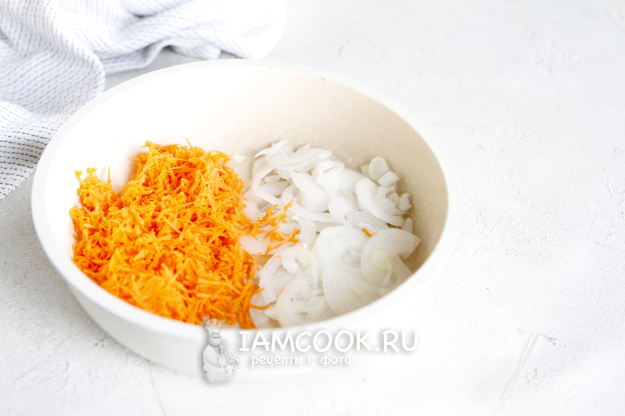 Лук нарежьте полукольцами, морковь натрите на мелкой терке.
