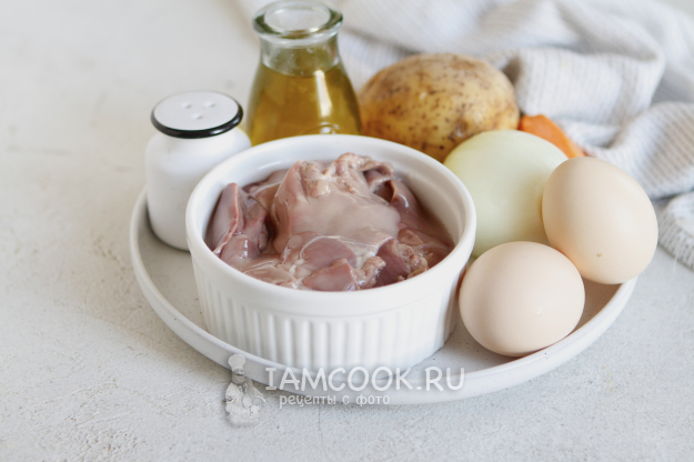 Вот такой набор продуктов я собрала, для того чтобы приготовить печеночную запеканку в аэрогриле.