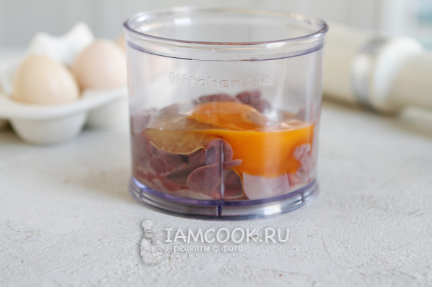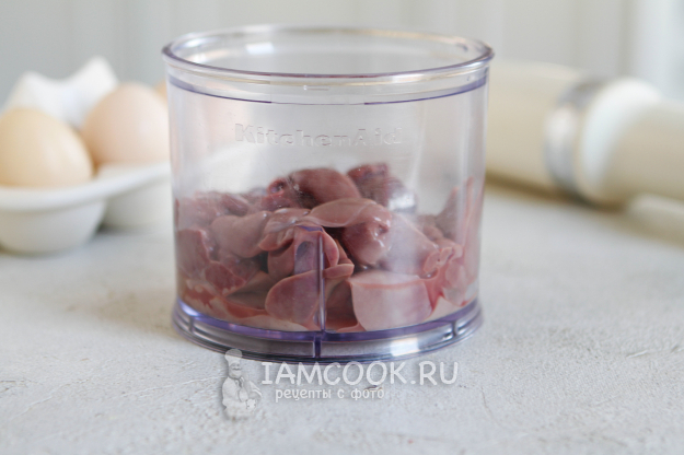 Куриную печенку промойте под проточной водой. Срежьте у нее жилки, удалите сгустки крови. Нарежьте на небольшие кусочки и переложите в чашу блендера.