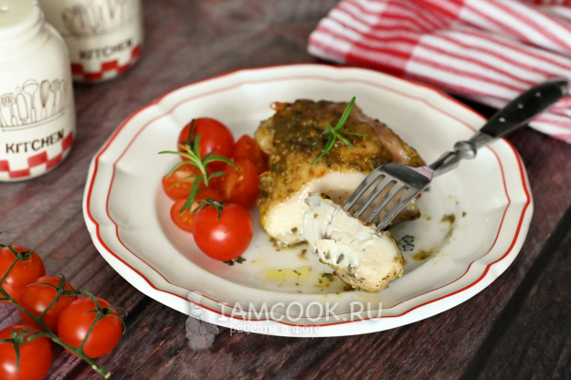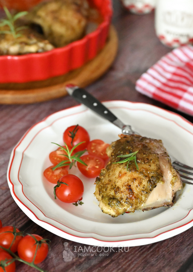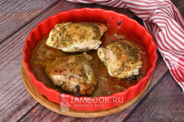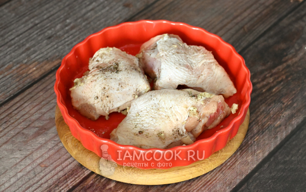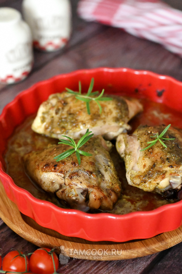 В таком виде отправьте куриные бедра в духовку, разогретую до 180°С, и запекайте до готовности.