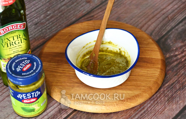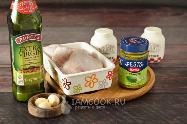 Соберите продукты для приготовления курицы в соусе песто в духовке.