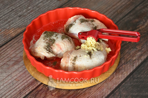 Бедрышки сполосните, обсушите и сложите в форму для запекания. Посыпьте солью и перцем и добавьте чеснок через пресс.