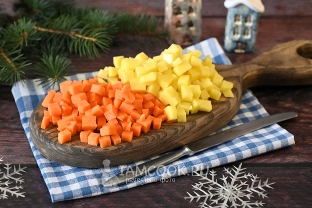 Вскипятите в кастрюльке воду, чуть подсолите её. В кипящую воду забросьте сначала морковь и варите её примерно 5-7 минут, затем сюда же добавьте кубики картошки и продолжайте варку ещё примерно 10 минут. После чего кубики овощей откиньте на сито или достаньте шумовкой и полностью остудите.