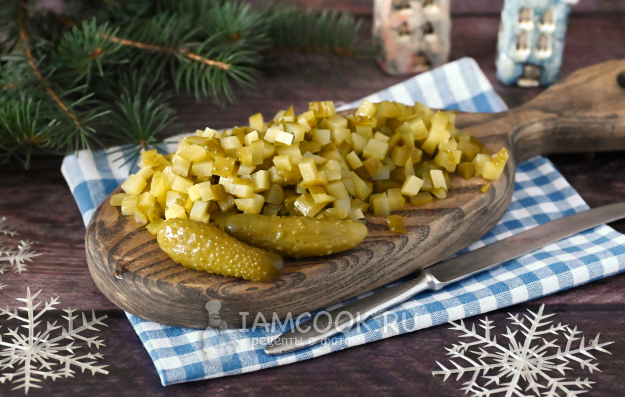 Корнишоны также нарежьте небольшими кубиками. Вообще, считается, что размер кубиков, которыми нарезаются продукты в оливье, должен по калибру совпадать с зелёным горошком.