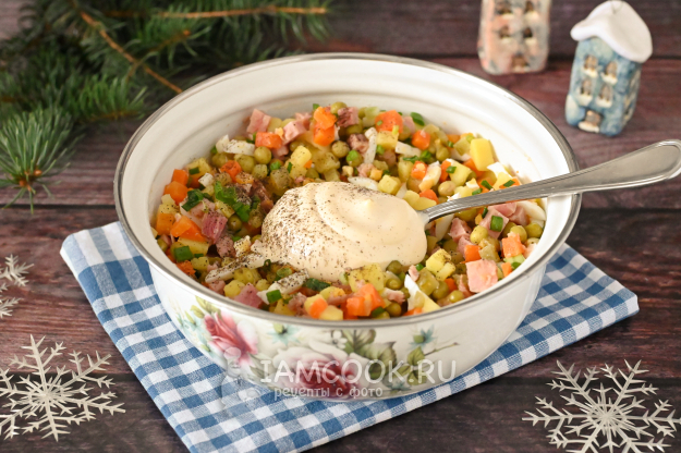 Из тазика можно было отсыпать нужное количество салата, добавить в него майонез и обязательно немного поперчить. Соль добавлять уже не нужно, так как овощи отваривались в подсоленной воде.