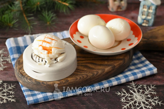 Яйца нарежьте кубиком при помощи ножа или яйцерезки.